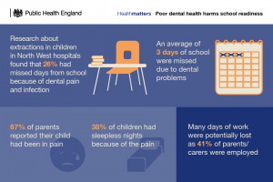 Poor oral health impacts on children and families wellbeing and is costly to treat. It suggests wider health and social care issues such as poor nutrition, obesity, the need for parenting support, and in some instances safeguarding and neglect. Children who have toothache or who need treatment may have to be absent from school. Parents may also have to take time off work to take their children to the dentist. Dental treatment is a significant cost, with the NHS in England spending £3.4 billion per year on all ages primary and secondary dental care (with an estimated additional £2.3 billion on private dental care).